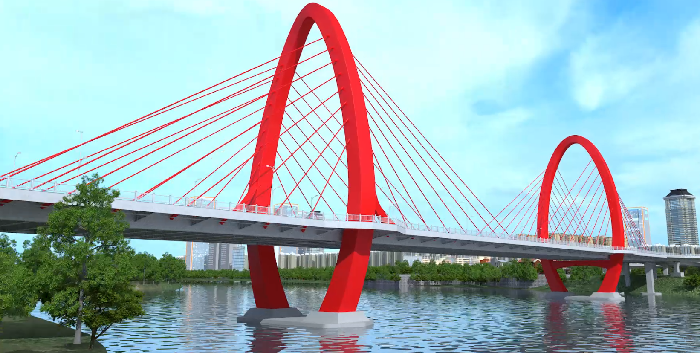 龍巖大橋位于龍巖市中心城區,是龍巖市“一軸二環三眾四橫”快速道路系統里南北向交通中心軸和景觀軸線。主橋連續跨越六條城市主干道,施工難度極大,主橋采用不對稱塔梁同時轉體施工,創造了最大轉體重量,最大轉體懸臂,最大轉體梁寬,最大傾斜角度下塔柱四項世界紀錄。 -