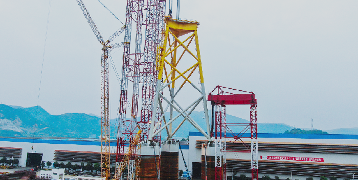 長樂外海海上風電場C區項目位于福州市長樂區東部海域、閩江口南岸,場址距離長 樂海岸線31千米~50千米海域,平均水深37米~45 米。福建船政承接該項目25套吸 力式導管架制作工程,其中單套三筒導管架高度近百米,底部最大尺寸超40米,單套導管 架最大重量約1200噸。